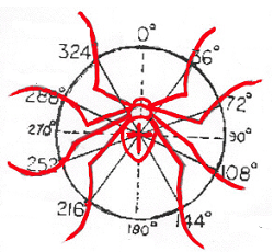 Here is a picture of a spider on a circle. If we start at the top of the circle, at 0°, and travel once clockwise all the way around the circle, we turn through a rotation of 360°. Each of the spider’s legs intersects the circle at a fraction of one complete rotation. Name the fraction at each leg, and reduce it if possible.
