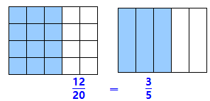 We can reduce a fraction if we can arrange the shaded and unshaded pieces into larger groups of equal size. For example, to reduce \(\dfrac{12}{20}\) we form groups of four pieces each:
