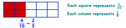 For example, the fraction \(\dfrac{4}{10}~\) can be reduced to \(\dfrac{2}{5}~\text{.}\) You can see that these two fractions are equivalent — that is, they name the same portion of one whole.
