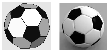 The picture on the left below shows a solid figure called a truncated icosahedron (eye-kosa-he-dron). If you inflate it a little bit, you get a soccer ball. The surface of the soccer ball is made up of 20 hexagons and 12 pentagons. The hexagons have six sides (the white pieces), and the pentagons have five sides (the black pieces).