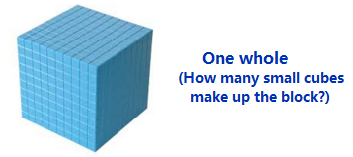 Here is a way to think of decimal fractions. Imagine that the 10 by 10 by 10 block shown below represents one whole.