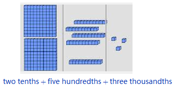 \text{two-tenths} \amp + \text{five-hundredths + three-thousandths}
