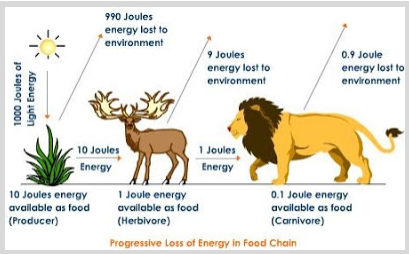In 1942 the ecologist Raymond Lindemann put forth the ten percent law for the transfer of energy in the food chain. His law suggests that 90% of the energy is discarded or lost in the transfer at each level of the food chain, and only 10% is passed on as useable biological energy.