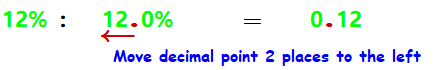 12% means twelve hundredths, so we divide 12 by 100. We move the decimal point 2 places to the left.