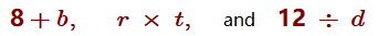 For example, the expression \(8 + b\) might stand for 8 dollars more than the bill, and \(r \times t\) is often used to represent rate (or speed) times time.