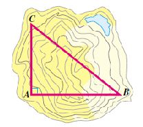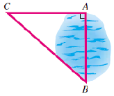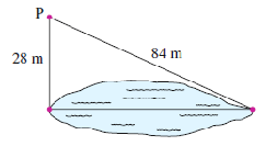 A surveyor would like to know the distance across the lake shown. She picks a spot on a line perpendicular to the width of the lake, and measures the two distances shown. How wide is the lake?