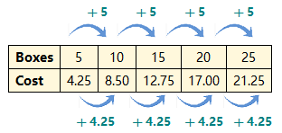 Because the cost of the crayons is proportional to the number of boxes, we can make a table. We add copies of 5 boxes and $4.25 until we reach 25 boxes.